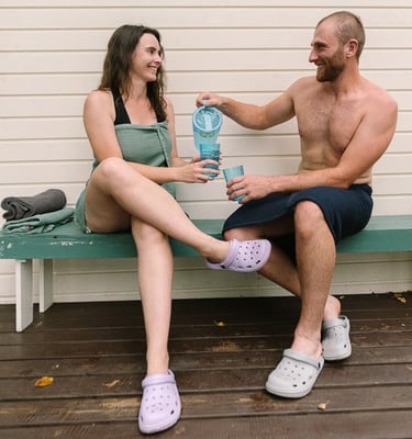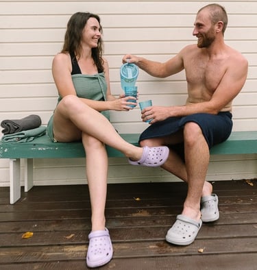 Comienza con un recorrido rápido por las instalaciones, donde te explicarán sus usos. Dentro del vestuario, recoge tu toalla, tus crocs y ponte cómodo para entrar a la sauna. Ríndete cómodamente sentado al aroma de los aceites esenciales y de la madera, al sonido del chisporroteo de la estufa y al silbido del agua que se evapora sobre las piedras. Ajusta el ritmo del ambiente salpicando más o menos agua sobre las piedras mientras te relajas, dejando que el calor y el vapor hagan su magia, aliviando tu tensión, abriendo tus poros y dejando tus músculos maravillosamente relajados. Una vez satisfecho tu deseo de calor, aprovecha la terraza para refrescarte y rehidratarte, o date un baño en el río. En el exterior le espera una vista excepcional del río, sus islas y las colinas circundantes. Sin olvidar que por la noche podrás tener la oportunidad de observar la aurora boreal bailando encuima de tu cabeza. Es la alternancia de calor y frío lo que relajará tu cuerpo, abriendo y cerrando tus poros, anudando y desanudando tus músculos. Para completar la experiencia, aprovecha para llevarte una cerveza y disfrutar de un momento de óptima relajación.